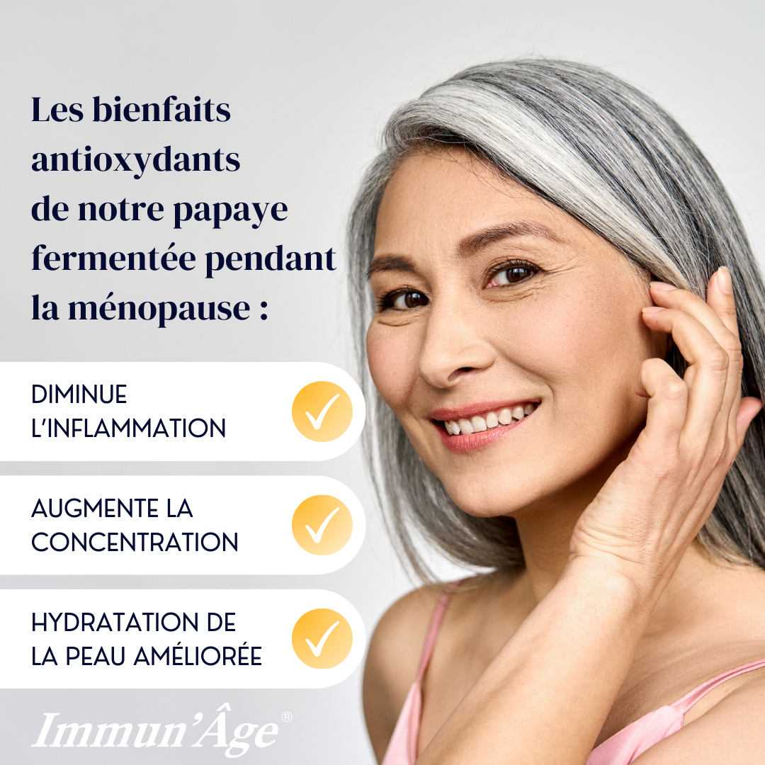 Immun’Âge, grâce à la puissance antioxydante de la papaye fermentée, agit en profondeur pour aider votre corps à mieux s’adapter à ces changements et à retrouver équilibre et vitalité.